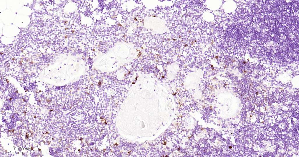 Immunohistochemical analysis of paraffin embedded Human thymus tissue slide using IHC0619H (Human CD134 Kit).