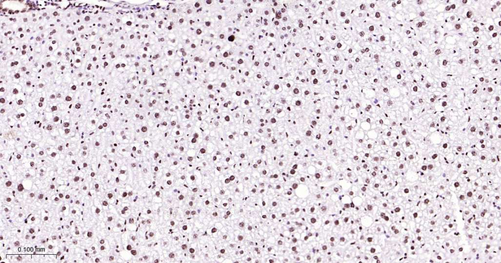 Immunohistochemical analysis of paraffin embedded Mouse liver tissue slide using IHC0665 (Nucleolin Kit).