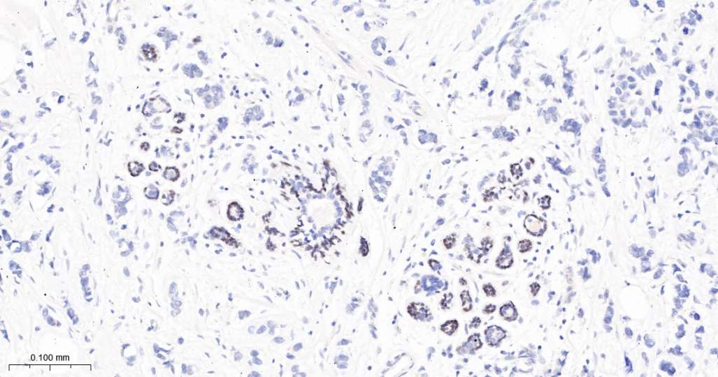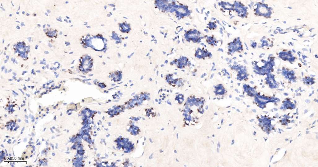 Immunohistochemical analysis of paraffin embedded Human mammary gland tissue slide using IHC0685H (Human P63 Kit).