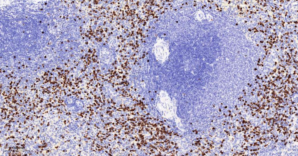 Immunohistochemical analysis of paraffin embedded Human spleen tissue slide using IHC0686H (Human FUT4 Kit).